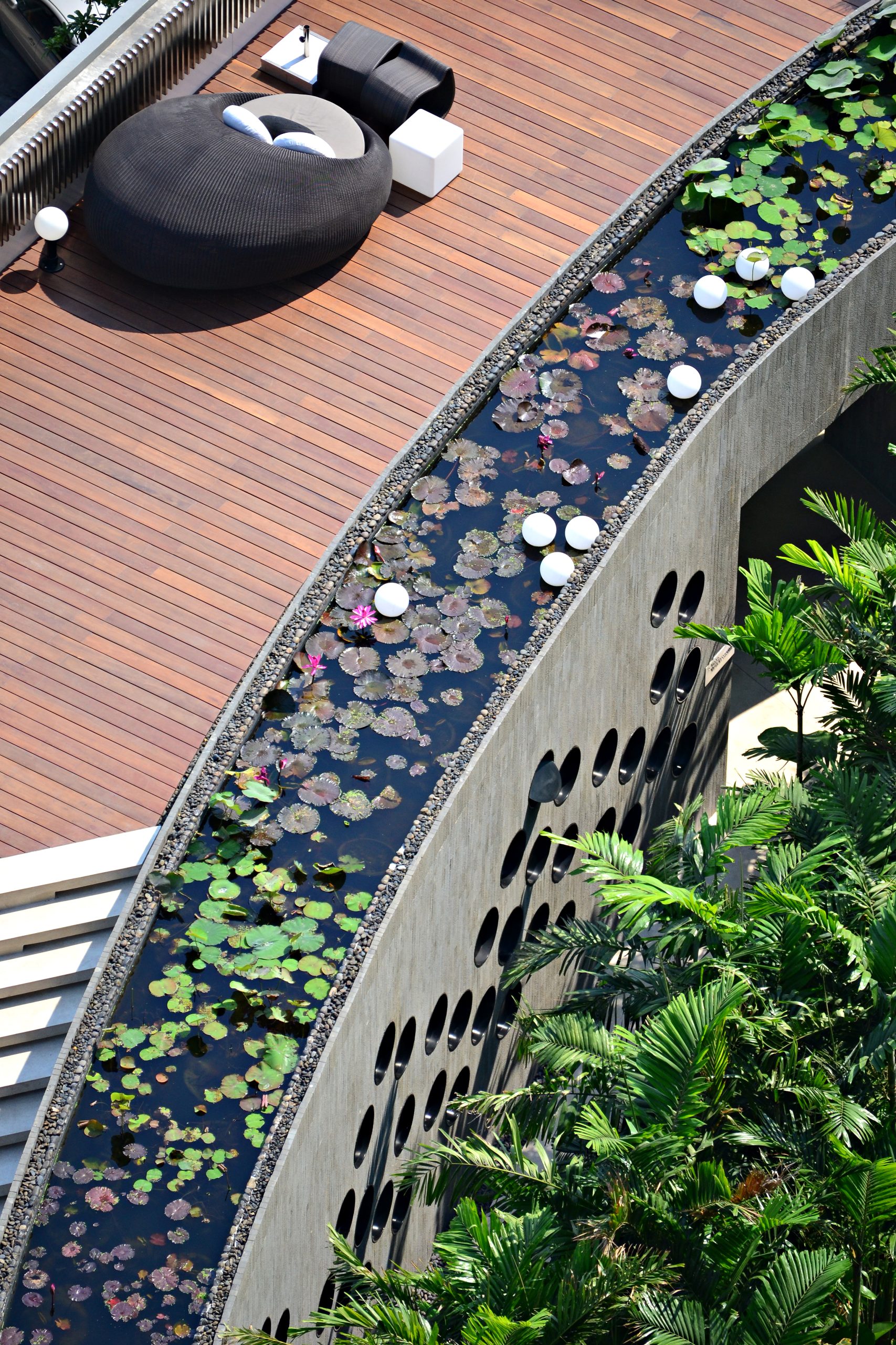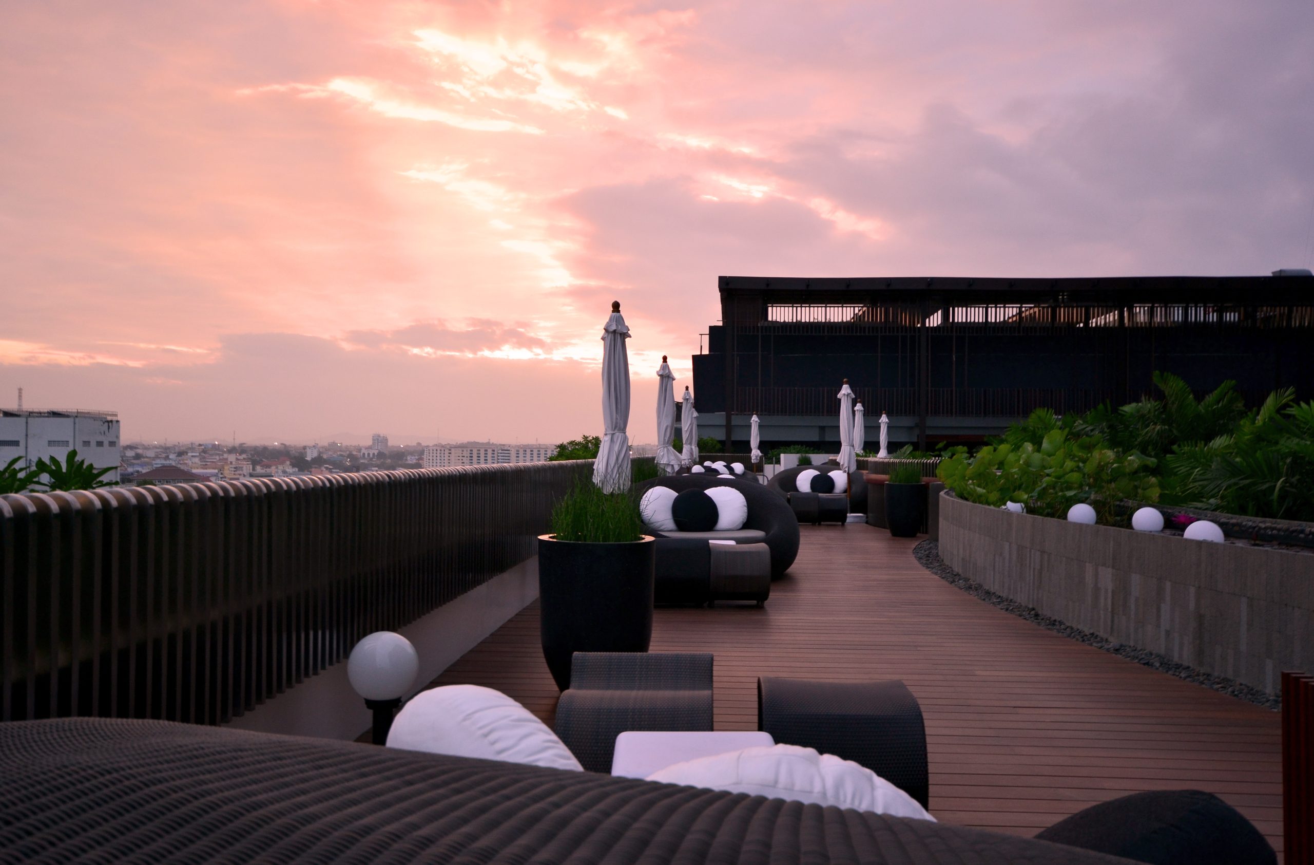 Pattaya is a two-hour drive from Bangkok. Historically, it was famous for beautiful long beach and unobstructed sea view. However, lacking local regulations, the beach is now crowded with nightclubs and bars. In order to avoid the noisy beach, Hilton Pattaya, a 200 rooms hotel, is built on the roof of a new shopping centre. Our original task was to create an urban sanctuary hidden from chaotic beach below. The goal is to re-connect the landscape with Pattaya's beautiful sea view. Because of the limited area, we had to re-organize the overall spatial structure of the garden.
