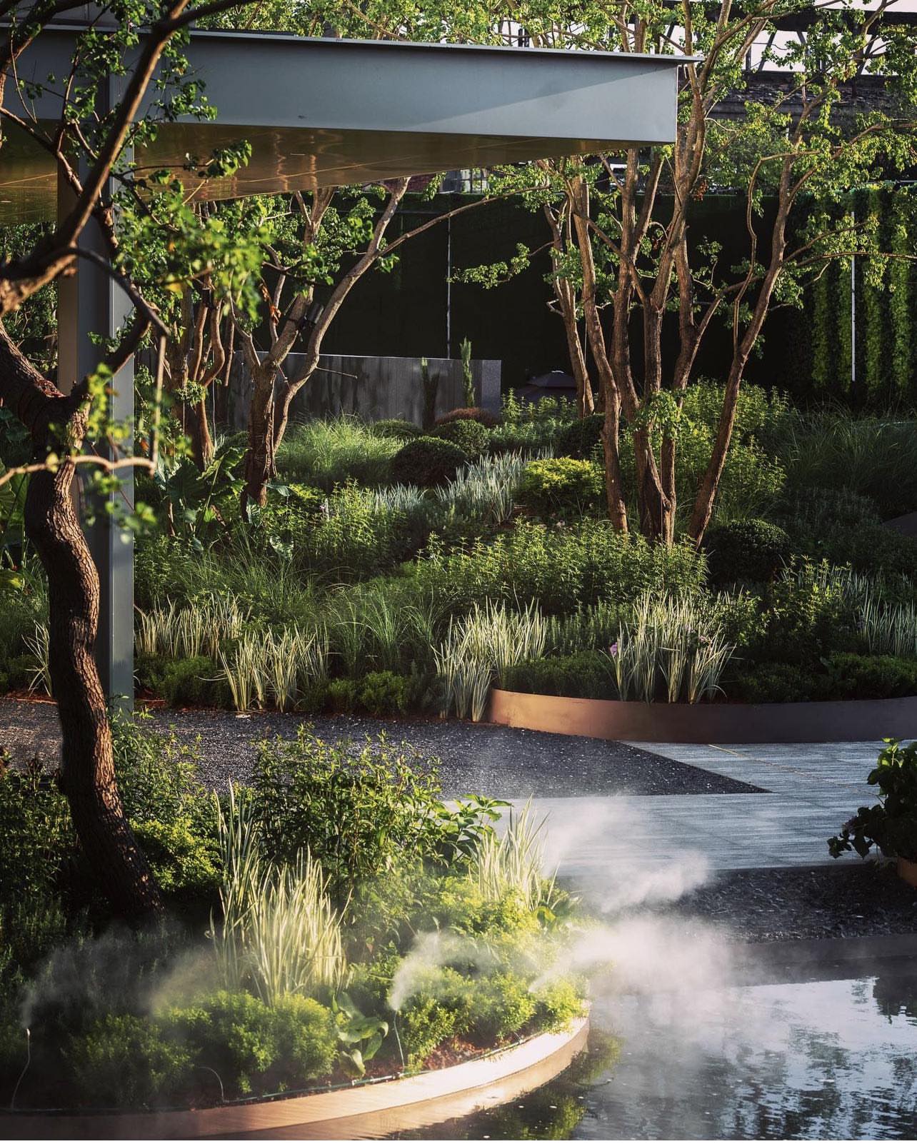 At the end of the forest court, the ornamental garden, the landscape of sense, immerses the visitor in the beauty of the landscape and creates an illusion of urban escape. With recycled gravel floor and well-composed perspectives, the visitor becomes aware of the crunching walk underneath, the sound of gurgling water, and the misty forest from afar. Together, the orchestration of light, water, and texture make the space full of peace and mystery.
