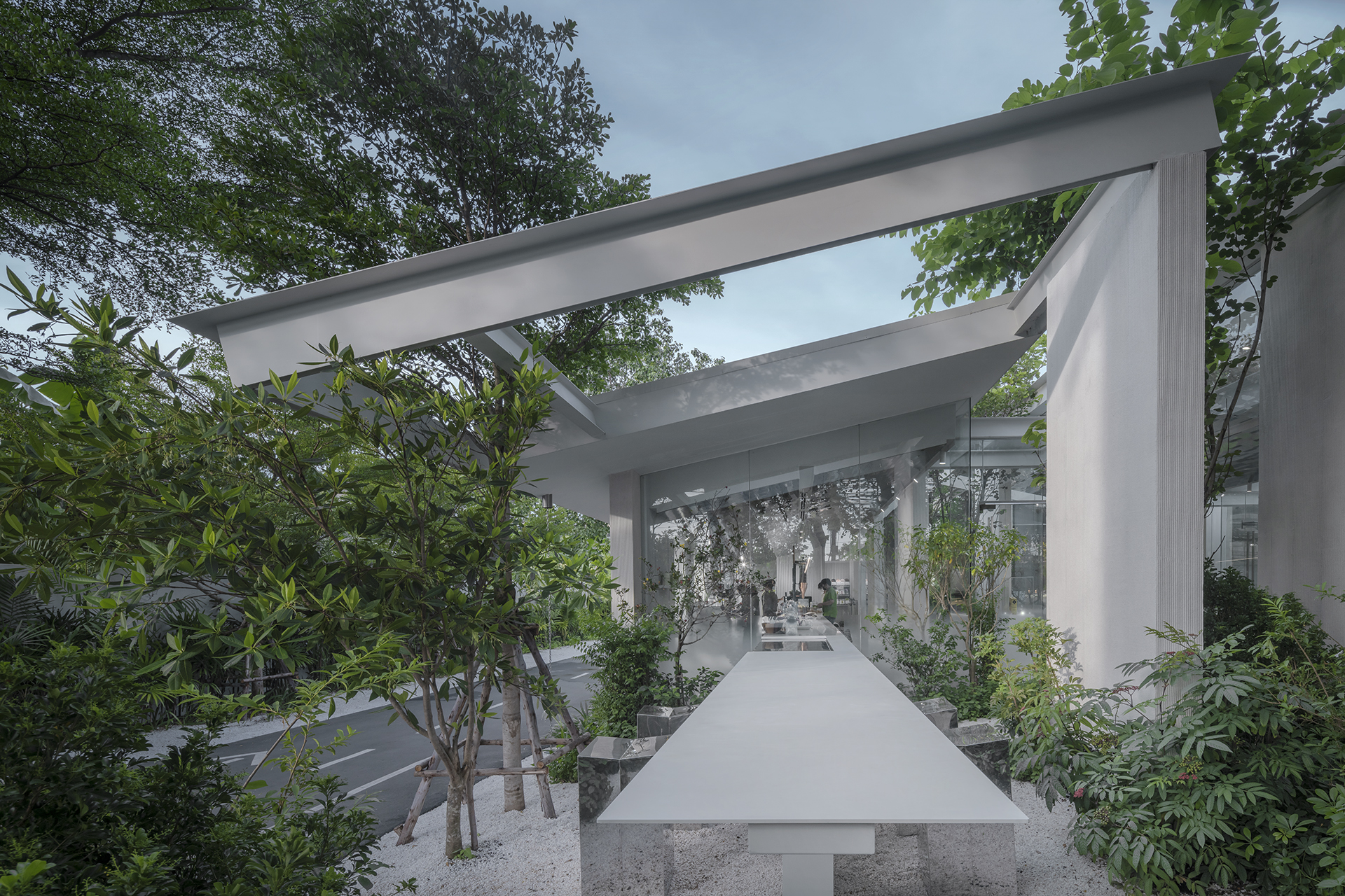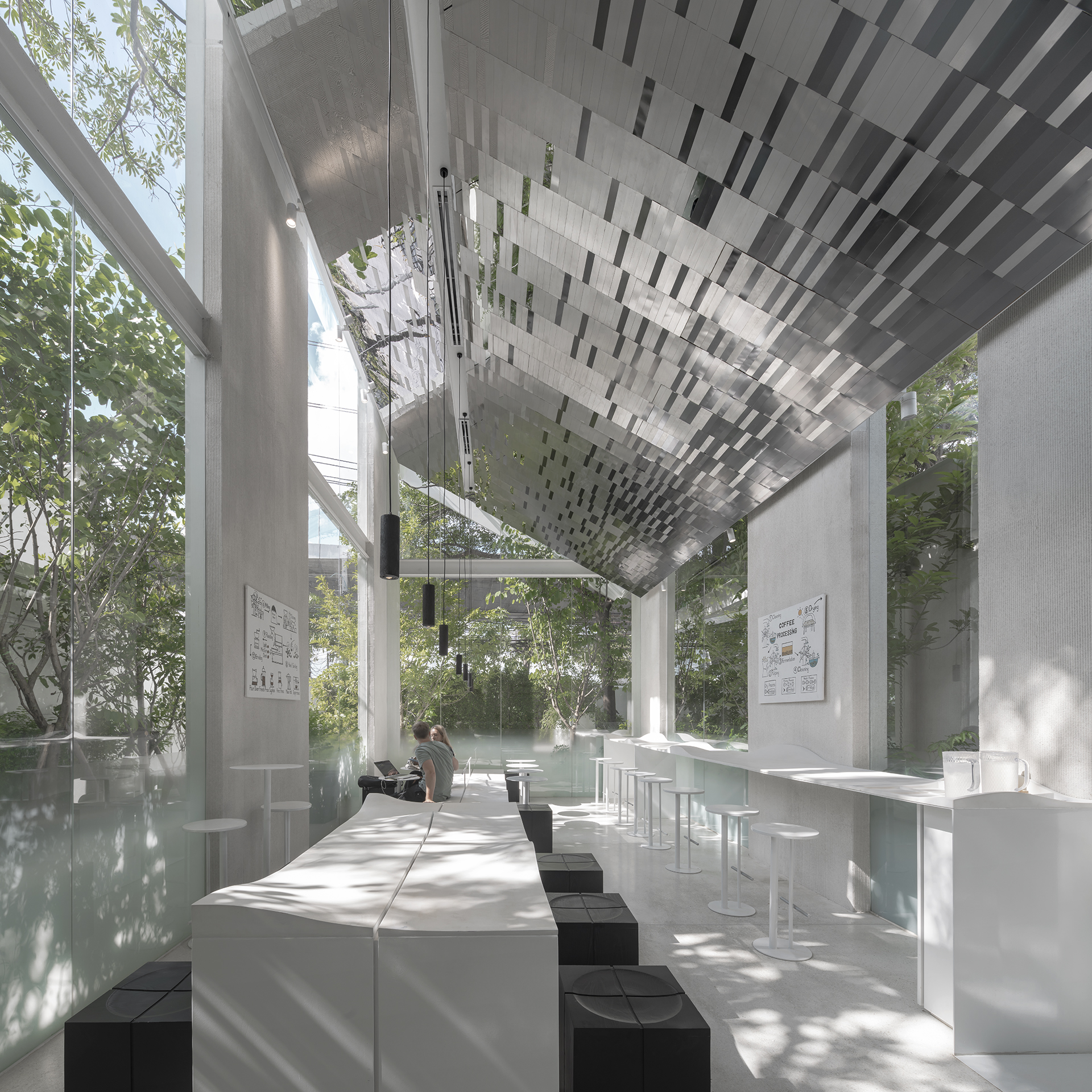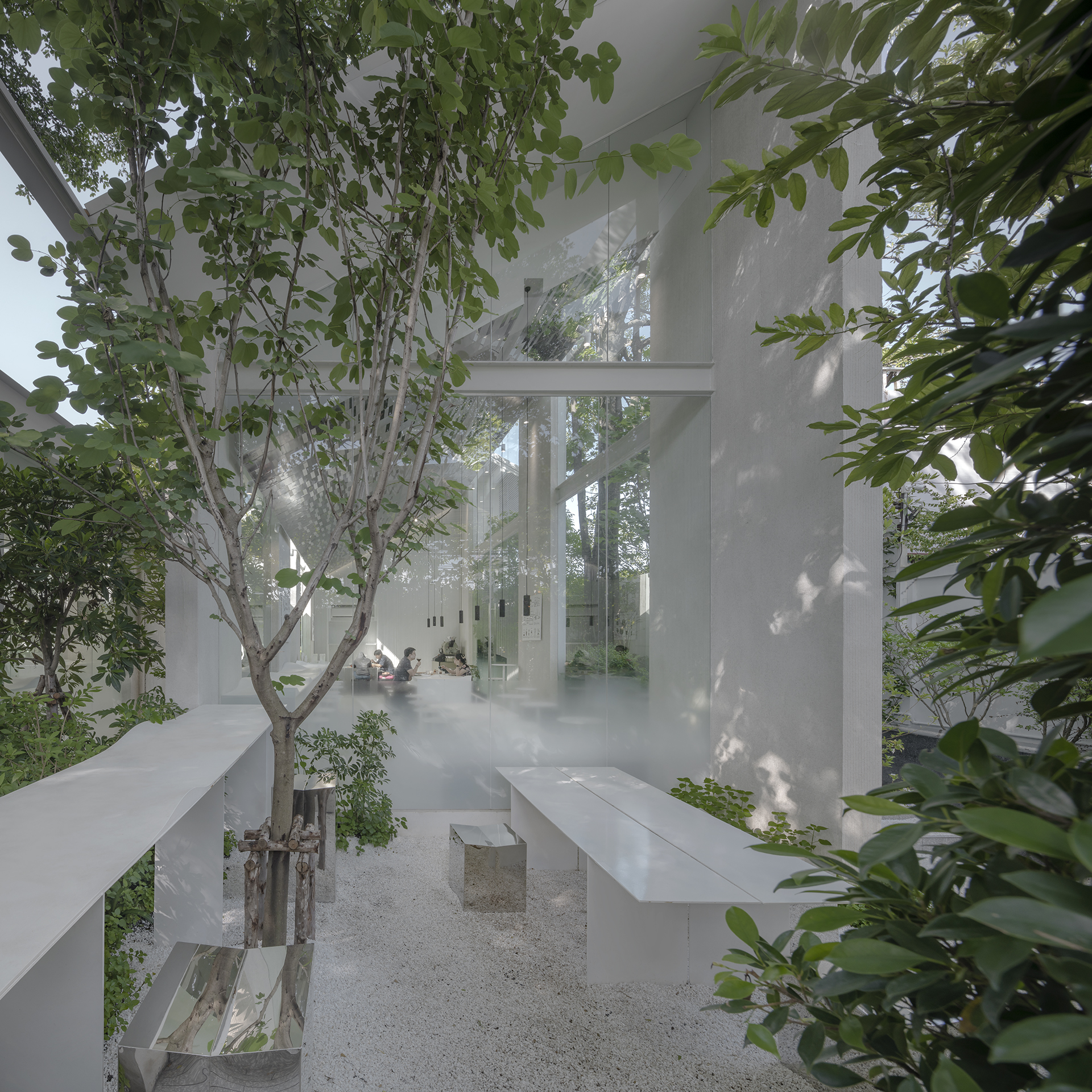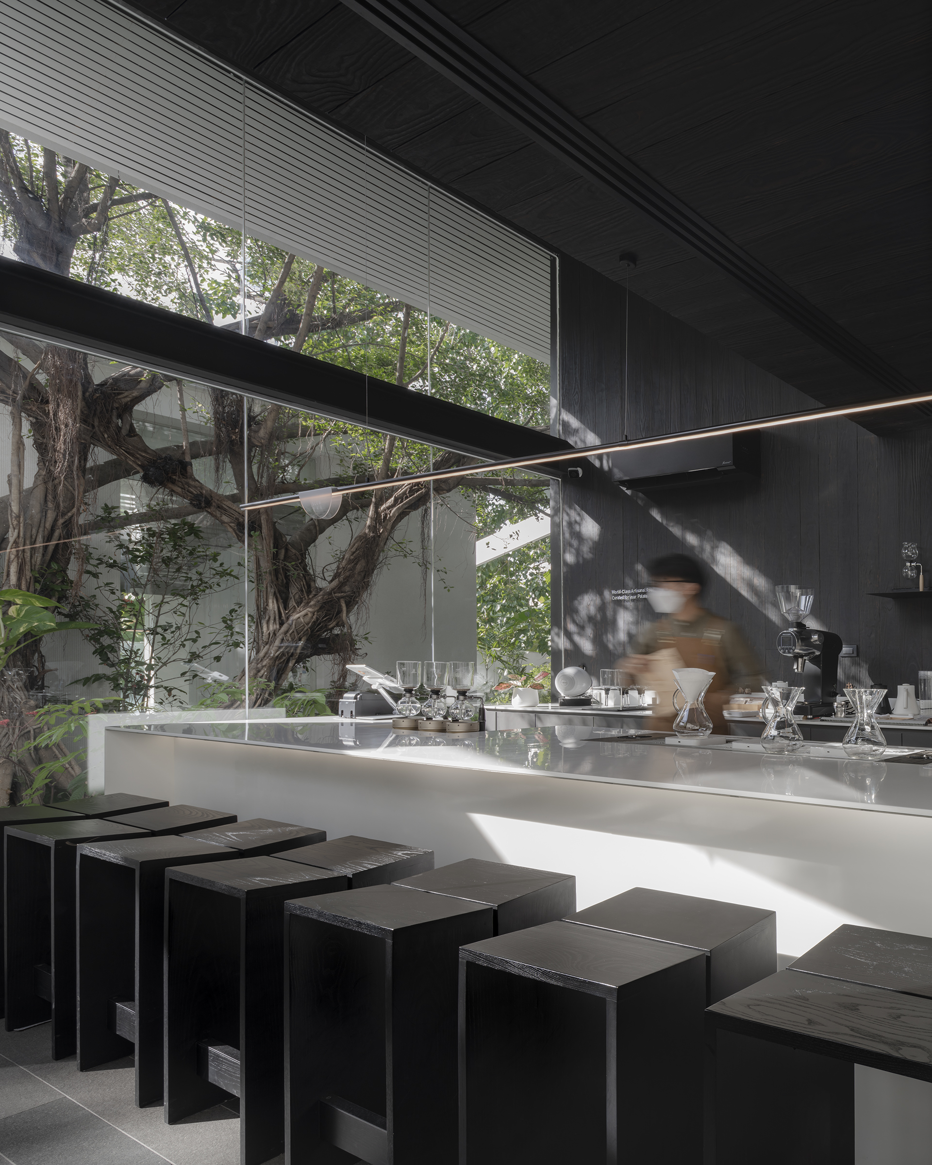 Located in the large commercial/residential district of Bangna, Nana Coffee Roasters Bangna introduces a café design alternative that blurs the boundary between architecture and lush landscape, drawing visitors away from the buzzing Bangna-Trad motorway, redirecting their focus onto the coffee-drinking experience. Through this concept, the boundaries between three practices— architecture, interior, and landscape—are blurred. This ‘blurred’ space creates undefined areas where Instagrammable is much less important than the visitor’s experience of indulging in a high-quality cup of coffee within the surrounding nature. A series of landscape layers help create a micro-environment for both humans and animals in the area. First, lush greenery protects the property from noise, dust, pollution, and even vibrations from heavy traffic outside. All existing trees were retained to provide a microclimate, reducing the overall temperature by a few degrees, compared to the surrounding highways and concrete masses. In certain areas, the green landscape was allowed to penetrate into the interior space, while some furniture extended from the interior to each garden terrace, creating an illusion of blending interior and exterior space together. At the same time, this urban sanctuary not only serves human users but also creates biodiversity, with many blooming plant species that provide homes and food for local birds and insects, especially bees and stingless bees