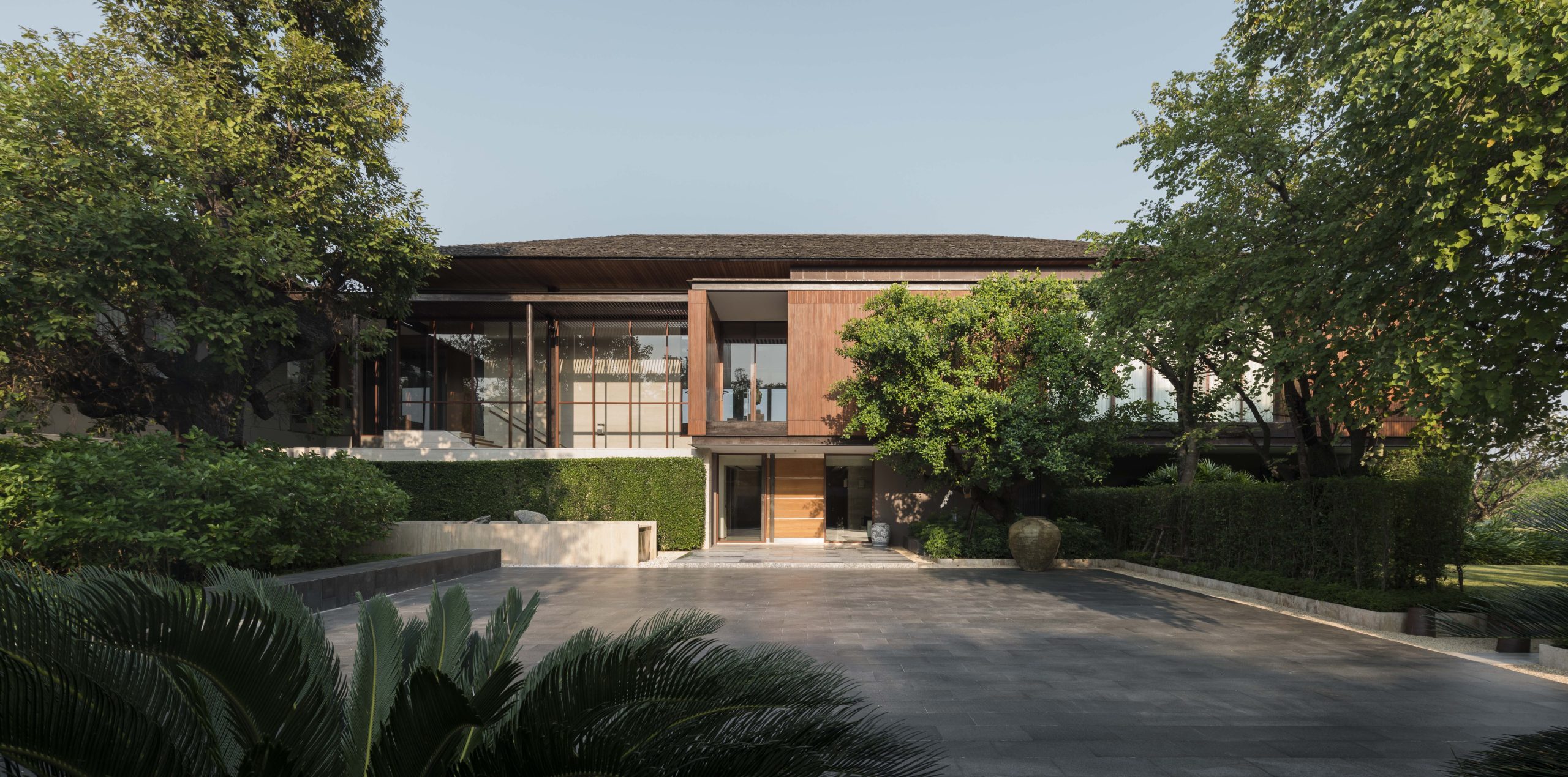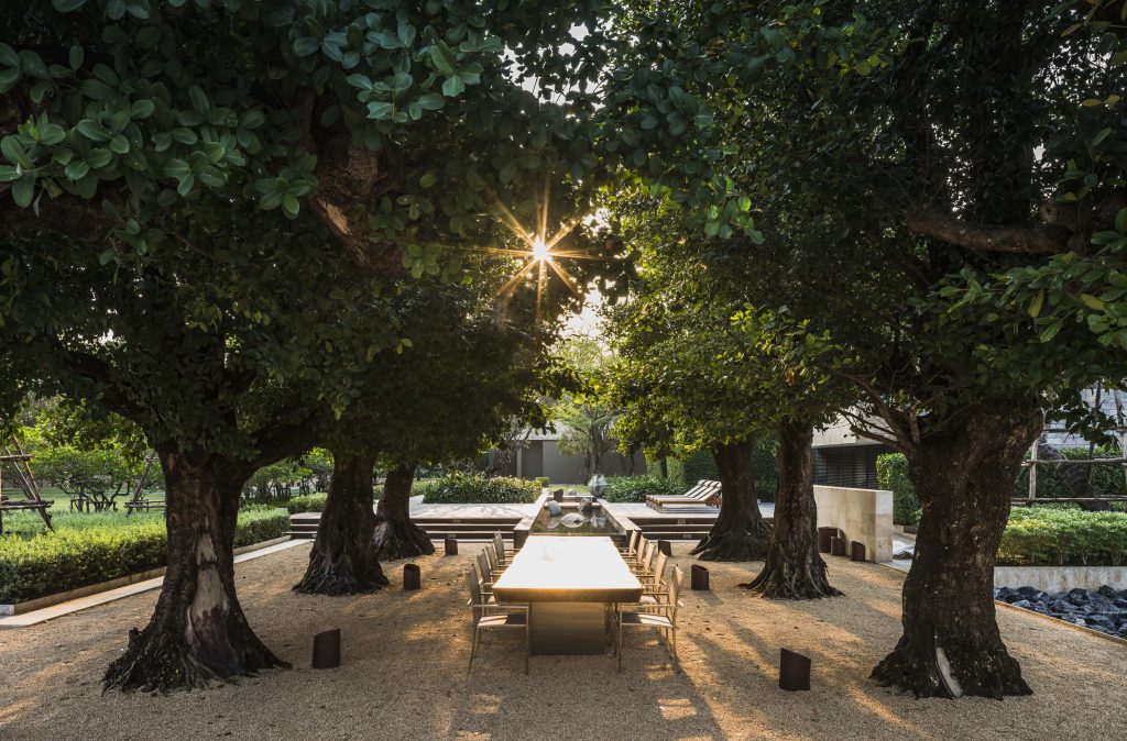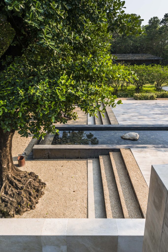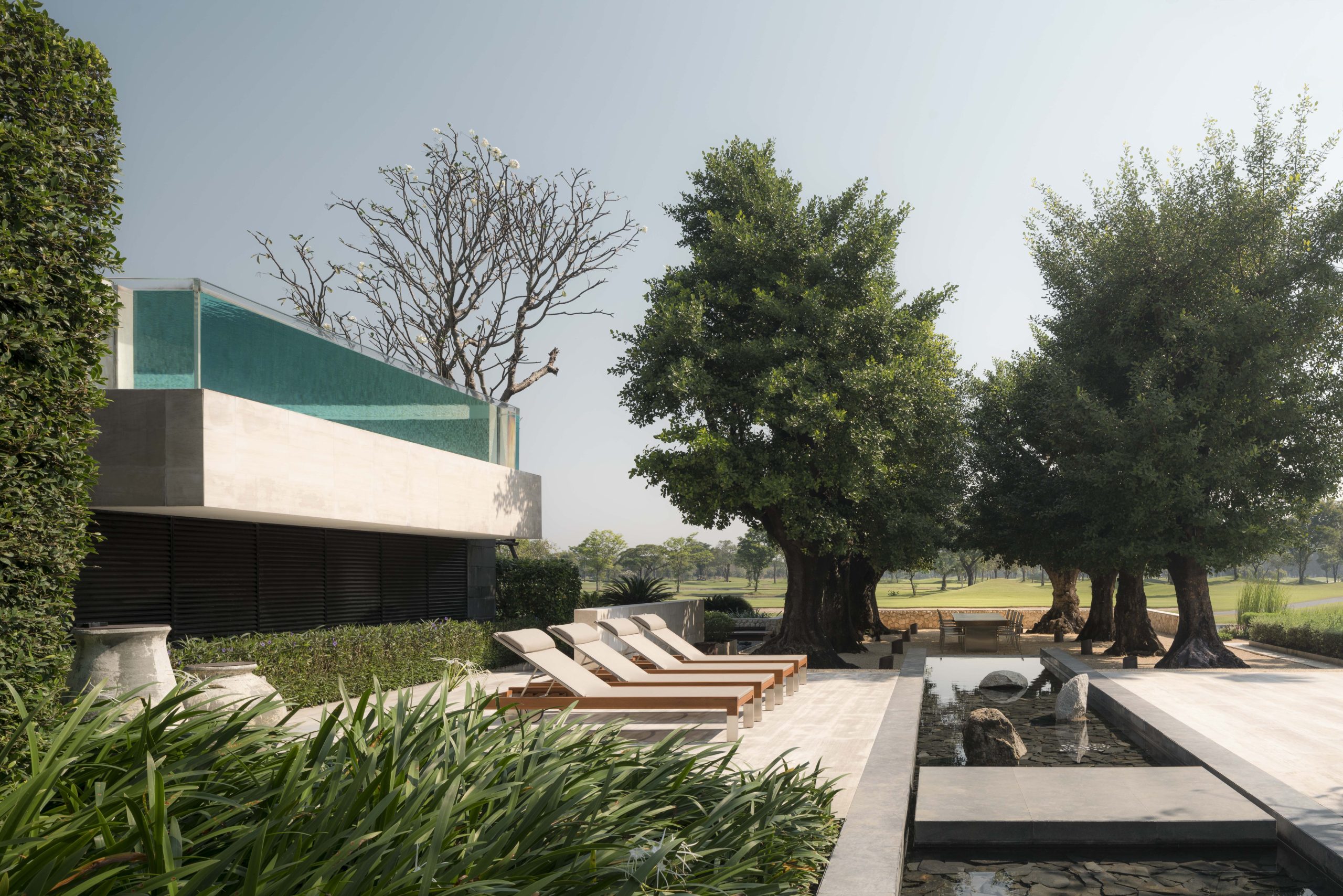 Each “Garden Room” is attached to the main circulation corridors. As an extension of the main house, they each offer differing purposes, such as a function room, a party room, a play room, a sitting room, a reading room and a dining room, and so on. But these outdoor spaces are composed of living elements: groundcovers, shrubs, hedges, and trees. Without any concrete barriers, the breeze wafts through the garden, providing a refreshing touch. The ceilings of these external spaces consist of green canopies, allowing the sunlight to permeate while also providing cooling shade. Outdoor seating under large established trees creates a wonderful area for al fresco dining. For inclement weather, additional seating is set beneath a large wooden pergola, while bronze statues of rabbits look over a manicured lawn.